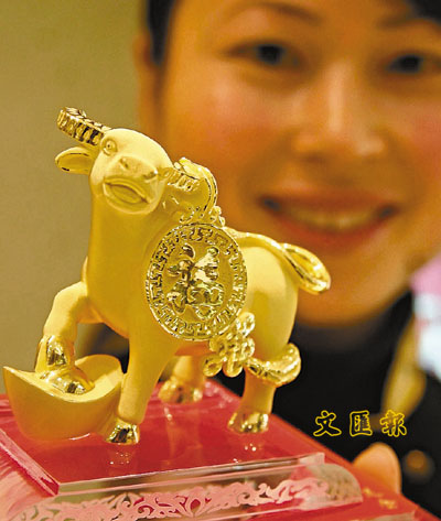 安徽巢湖某金店的員工展示「黃金牛」擺件。09年是農曆牛年,造型各異的「黃金牛」擺件已經悄然登上商家貨櫃,吸引了許多顧客的目光。 新華社