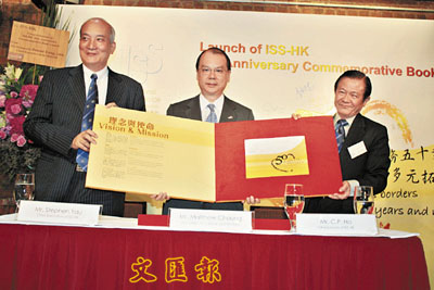 ■何掌邦和邱浩波陪同張建宗為國際社50周年紀念特刊主持發行禮。 本報記者陳巧顏 攝