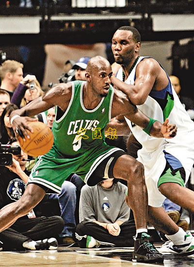 自上季被交易到波士頓塞爾特人後,昔日「狼王」加納特(左)周五始首次重返明尼蘇達作客倒戈母會木狼。加納特面對舊主未有手軟,取得全隊最高的17分,帶領塞爾特人以95:78取得大捷。 美聯社