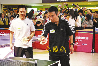 ■李靜(右)和高禮澤在商場內即席示範球技。 本報記者郭正謙 攝