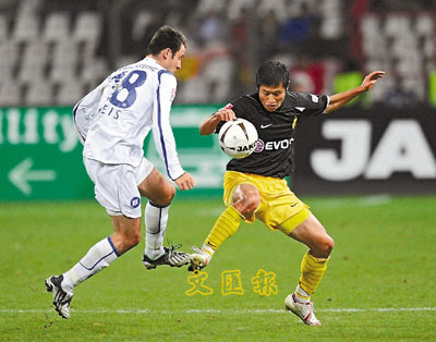 ■昨晨德甲第14輪聯賽,位處積分榜前列的多蒙特憑穆罕默德施丹一錘定音,作客以1:0力克卡爾斯魯厄。圖為卡軍前鋒費里斯(左)被李榮杓搶去腳下球。 美聯社