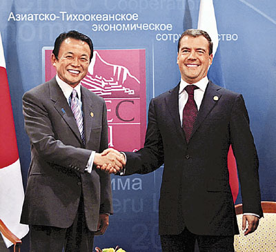 俄羅斯總統梅德韋傑夫對日本首相麻生太郎說,俄日雙方要解決好問題,否則只會成為地區局勢不穩的元素,他希望雙邊關係正常化不會把問題交給下一代,據日本一名官員透露,兩人已責成政府官員開始實質工作,並同意俄羅斯總理普京於明年上半年訪日。