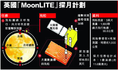 繼印度於本月中成功探月後,英國不甘示弱,計劃執行首次探月行動,建立月球基地,派一艘無人飛船繞月飛行,發射撞擊探測器插進地表,以探測月球發生地震的成因。探月計劃花費為1億英鎊(約11.6億港元),美國太空總署(NASA)會給予援助。探測船會於月球不同地點,先後發射共4個撞擊探測器。■《每日電訊報》