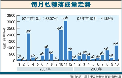 【本報訊】(記者 周穎)樓市前景不明,發展商一於謀定而後動,即使有貨在手,亦不急於落成及推售,拖低整體市場樓宇落成量。10月份屋宇署發出12份入伙紙(即落成項目),當中6份涉及住宅物業,合共提供1,148個私樓單位,數字較上月大幅急升429%,為自去年11月後再度重上逾千伙水平。