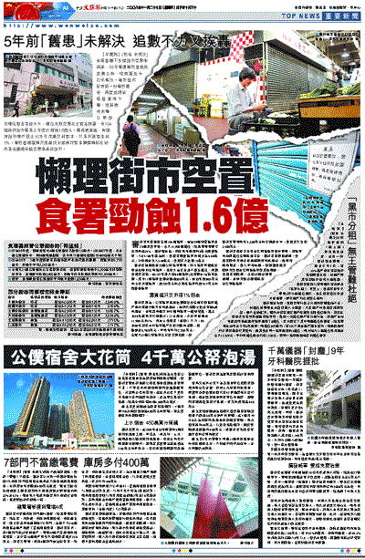 【本報訊】(記者 朱樂汶)食環署轄下多個街市空置率偏高,03年曾遭審計署狠批浪費公帑,惟問題至今仍未解決。審計署昨發表新一份審計報告,再度批評食環署管理不善,沒有積極改善,公眾街市檔位租金差距太大、檔位長期空置及分租等問題,令104個政府街市單是上年度已勁蝕1.6億元。報告更揭露,有個別街市檔戶過去10多年來繳交的租金,只是市值租金的1%。審計署建議局方應盡快全面檢討租金調整機制及研究是否繼續保留空置率高的街市。