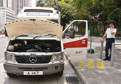 目前,消防處有252部救護車,逾72%(即176輛)屬高齡救護車。審計署關注到車隊老化,可能是導致救護車故障頻生的原因。報告又顯示,涉及救護車的交通意外由03年的133宗,增加至07年的163宗。而今年7至8月期間,有67宗救護車故障事故,其中53輛救護車已使用超過9年,佔總數8成,31宗故障發生時,救護車正在運送病人到醫院途中。