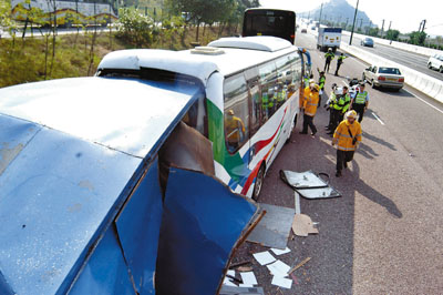 【本報訊】北大嶼山公路昨午發生城巴車長險遭「腰斬」的嚴重車禍。一輛雙層城巴,朝機場方向行駛途中,疑「跟車太貼」,當前行的2車收慢車速時,城巴煞車不及,猛然撞散前面一輛貨車的車斗,導致貨車車架恍如巨型鍘刀般插入城巴的車頭,僅差3吋便將車長鍘腰,兩車司機受傷被困。兩車挨撞後,再衝前撞向前面一輛旅遊巴及另一輛城巴,釀4車「串燒」意外;事件中,共12人受傷送院,幸各人傷勢均不嚴重。