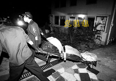 ■在檳榔灣燒炭自殺身亡的前無線助理編導遺體由仵工舁送殮房。