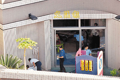 ■警員在男子墮樓現場調查。