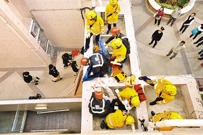 ■一名14歲學生,與同學在屋苑停車場頂樓玩捉迷藏時,失足墮樓受傷,消防員到場替他急救。