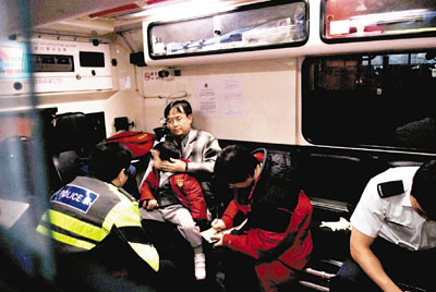 ■疑被小巴車門夾著衣物拖行的男童,在父親懷中接受治療。