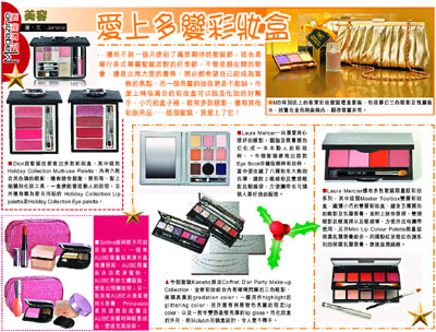 ■今個聖誕Kanebo推出Coffret D'or Party Make-up Collection,全新彩妝組合內有璀璨閃耀的三色眼影,兩種高貴的gradation color,一種用作highlight的glittering color,另外還有兩種發色亮麗的限定lip color,以及一款令雙唇晶瑩亮澤的lip gloss。而化妝盒的外形,則以clutch形鏡盒設計,令人愛不釋手。