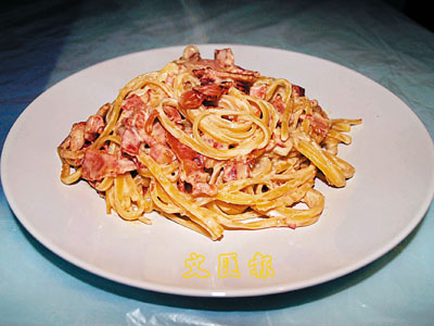 Carbonara一字來自Carbone,即英文的Coal,據說是由煤礦工人就地取材發明此種食法,故又稱為「煤礦工人麵」。(Three Steps Cooking)