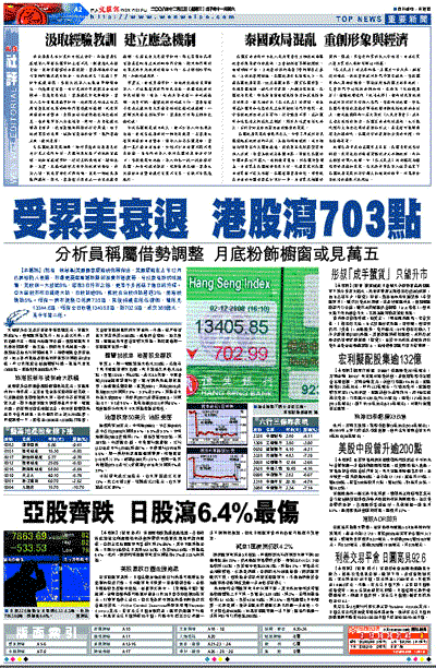 【本報訊】(記者 周紹基)美國國家經濟研究局指出,美國經濟在去年12月已開始陷入衰退,市場更憂慮聖誕期間的消費市道疲弱,令投資者恐慌性拋售,美股周一大挫近8%,結束5日升市之餘,更差不多抵銷了連日的升幅。亞太區股市昨日跟隨大跌,日股跌逾6%,韓股及台股均跌超過3%,而港股則跌5%。恆指一開市便裂口低開735點,其後持續在低位徘徊,曾低見13344.6點,恆指全日收報13405.8點,跌702.9點,成交385億元,是今年第二低。