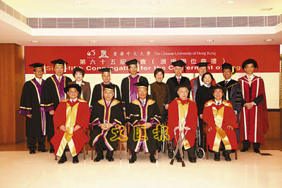 【本報訊】中文大學昨舉行第65屆頒授學位典禮,向4位本港及國際社會傑出人士頒授榮譽博士學位,以表彰他們對促進文化學術和社會經濟發展。大會同時亦向今年的畢業生頒授了6,600多個學士及高級學位,包括該校首批20名健康科學碩士畢業生。