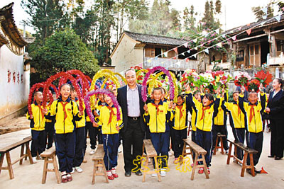 「吳健南希望小學」學生熱烈歡迎吳健南。