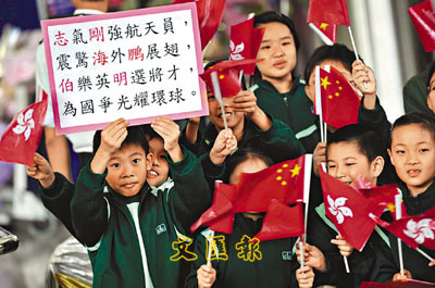■香港小朋友揮舞國旗、區旗及標語歡迎航天英雄。 新華社