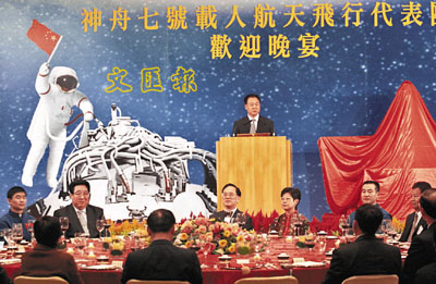 【本報訊】(記者 郭曉樂)「神七」成為完成太空漫步的中國人創舉,香港社會的焦點轉移至何時可以出現港產太空人。「神七」訪問團團長張建啟在回應本報記者提問時說,香港教育與科技都很發達,名牌大學實力強,人才濟濟,在載人航天科技領域發揮有重要作用。他鼓勵香港同胞加強身體和意志的鍛煉,及業務學習,「相信有一天,也就是不久的將來,會有香港航天員乘坐我們自己的飛船登上太空。」