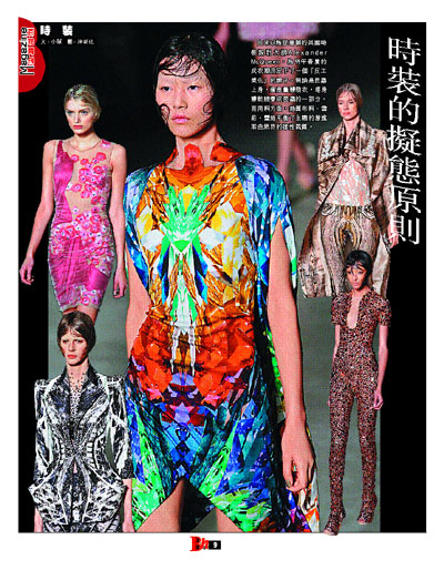 向來以叛逆著稱的英國時裝設計大師Alexander McQueen,為明年春夏的成衣潮流定下了一個「反工業化」的調子。無論是昆蟲上身,還是量體裁衣,將身體乾脆變成昆蟲的一部分,而用料方面,絲質布料、雪紡、蕾絲平衡了主題的激進和自然界的雄性氣質。