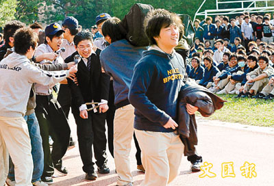 【本報訊】據東森新聞6日消息:今年馬英九母校建中校慶,除了依舊來了超人氣的校友馬英九外,校方主辦的變裝遊行也「政治味」十足。學生們各自發揮創意,把陳水扁遭收押、陳雲林來台等政治議題都KUSO了一番。除了搞笑,也顯示建中學生對政治議題的關注。