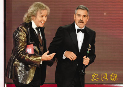 荷里活頂級鑽石王老五佐治古尼,擁有一顆善心已是人所共知的事,他亦為此原因現身德國柏林。蓄有小鬍子的佐治,前晚於名為《給兒童的心》的電視籌款節目中亮相,在主持人相陪下(上圖右)領取金心獎,以表揚他給予蘇丹災民的種種幫助。連同紅地毯儀式時突然掩嘴的動態(下圖),真讓人覺得他愈來愈像死黨畢仔了。■文:愚者/圖:路透社