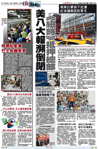 環球金融危機令報業經營更艱苦,擁有《洛杉磯時報》和《芝加哥論壇報》等8大報的美國報業巨擘論壇公司(Tribune Co.),由於資不抵債,正考慮申請破產保護。業界人士預期,在市場條件惡化下,論壇公司未來數月將有多份報章倒閉或尋求債務重組。另外,擁有《紐約時報》的紐約時報公司亦面對現金不足問題,計劃將總部大樓作抵押,借貸2.25億美元(約17.4億港元)。