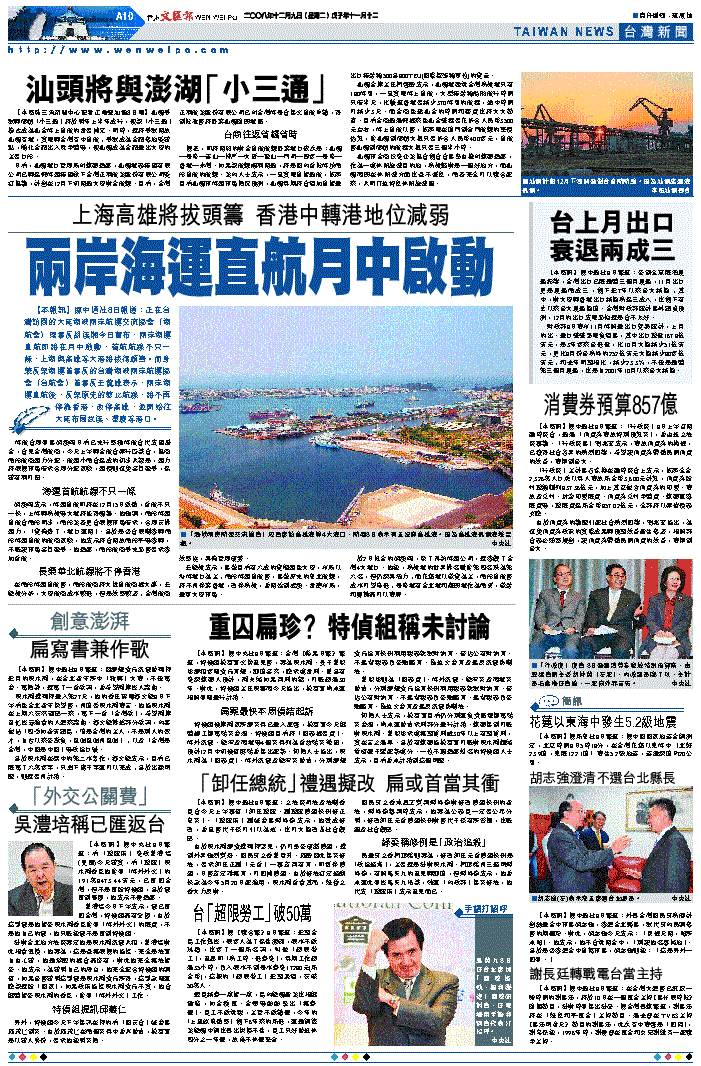 【本報訊】據中通社8日報道:正在台灣訪問的大陸海峽兩岸航運交流協會(海航會)理事長胡漢湘今日宣布,兩岸海運直航即將在月中啟動,首航航線不只一條,上海與高雄等大港將拔得頭籌。而身兼長榮海運董事長的台灣海峽兩岸航運協會(台航會)董事長王龍雄表示,兩岸海運直航後,長榮原先的華北航線,將不再停靠香港,改停高雄,並開始往大陸布局武漢、重慶等港口。