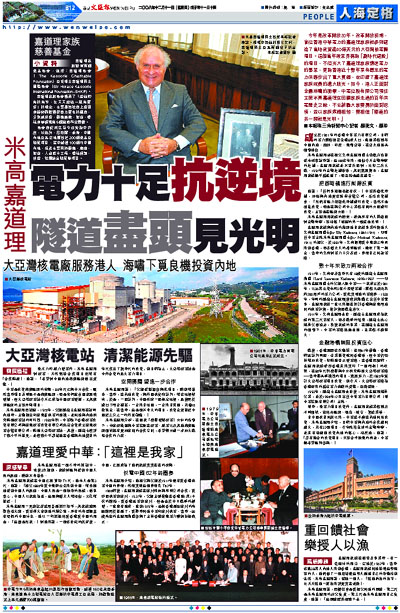 今年是改革開放30年。改革開放初期,掌控香港中華電力的嘉道理家族就參與建造了當時耗資達40億美元的大亞灣核電廠項目。這個當年被業界稱為「劃時代建設」的項目,不但光大了嘉道理家族情迷電力的事業,更為香港近十數年享有穩定的電力供應作出了重大貢獻,也印證了嘉道理家族成員的遠大眼光。如今,港人正面對金融海嘯的衝擊,中電控股有限公司現任主席米高嘉道理在回顧家族走過的百年供電歷史之餘,不忘鼓勵大家要勇於面對逆境,並以家族雋語相勉:要相信「隧道的另一頭就是光明。」