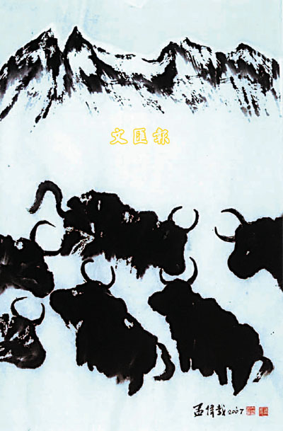 「山蒼蒼,雪茫茫,大風咆哮天欲狂。冰雪高原抗嚴寒,唯我(牛+毛)牛最頑強。」這是我在一幅六尺(牛+毛)牛畫上的題詞。(本報北京辦事處供稿)