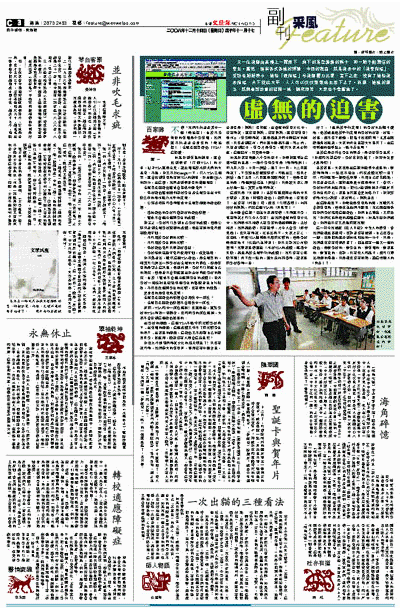 這一切令我想起《狂人日記》中吃人的禮教。當我們說誰迫害誰時,也許並沒有想到,自己也參上一腳,也是把局面弄到如此田地的一分子。只是,我們誰也沒有時間反省了,因為還有一個又一個的評估,是對學校的、對學生的、對教師的、對家長的、對官員的。也許,只有死人和瘋子,還可以發出清醒的囈語,只是誰也沒有閒情,聽這些煩人的「噪音」了。