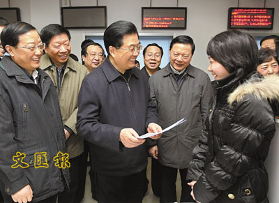為了解就業和再就業情況,胡錦濤專程來到瀋陽人力資源市場考察。他走到一個個服務窗口前,同工作人員和前來求職的群眾親切交談,了解各項服務的具體內容、辦理程序和群眾滿意度。