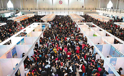 另據新華社報道,「2009年北京地區畢業研究生專場供需見面、雙向選擇招聘會」14日舉行。據北京市人事局介紹,當日進場求職的研究生在4萬人左右,幾乎每個招聘展位前都排起了長龍。上午最高峰時,求職的人只能在各展位間緩慢移動。一名太原理工大學的碩士生認為,目前全球正處於金融危機的困難時期,就業形勢不好是自然的。他表示自己已經不太在乎工資待遇了,只要能找到工作就行。