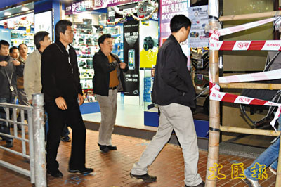 ■保安局局長李少光籲市民舉報擲鏹水彈狂徒。圖為探員昨繼續在擲鏹水傷人案現場進行問卷調查。