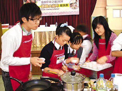 早前參加「全港中、小學健康鮮味之旅2008暨鮮味大激鬥」工作坊的中學生,日前於中華基督教會望覺堂啟愛學校示範廚藝及進行競技比賽。
