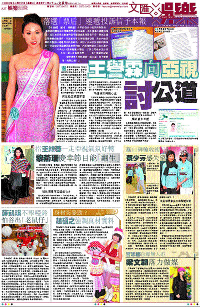 而本報記者昨日收到王譽霖特從雲南昆明以特快專遞寄來的申訴信,並附上內地多份報章的剪報,剪報內容大指王向內地記者哭訴賽果不公,及一封她寫給亞視副總裁葉家寶的信,內容指她對自己在比賽中只有9214票感到難以置信,她在信中表示:「……我公司統計至少每天有一萬人在為我投票,一部分投票的人把投票成功的範本發給我公司的助理,有十幾萬的紀錄,怎麼可能只有9214票!全雲南省和其他省份甚至我國外的朋友每天都在為我投票!您覺得你們的票數說得過去嗎?現在比賽已經結束,我想也不會影響到拿獎的任何人,請您公平公正的還我票數,這個9214的票數不是侮辱我個人,而是侮辱了全雲南省和各個國家地區為我投票的人的心!……您覺得是不是該還我一個公道!我不要獎項!我要公道!……」