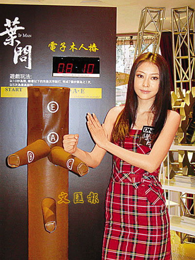 【本報訊】熊黛林(Lynn)、黃又南、池內博之昨日到銅鑼灣宣傳電影《葉問》,眾人更與G.O.D合作設計迷你木人樁,不過Lynn的木人樁就過於華麗。Lynn表示電影早於上星期已在內地公映,其家人亦已看過,覺得她的演出合格,會支持她。她又表示近日推去一個電影的演出機會,因為戲裡的角色是模特兒,Lynn直言不想在戲中再做模特兒,覺得觀眾會沒有新鮮感,希望做一些跟平時很不同的角色,如慘情或淒美的愛情片,問到她可會接受演垃圾婆?她即說:「我驚我handle唔到,唔好太難,要慢慢來。」