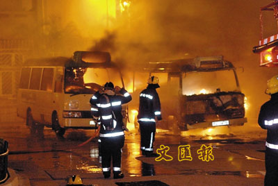 ■6輛停泊在樂華北h的專線小巴遭縱火焚燒,消防員到場灌救。