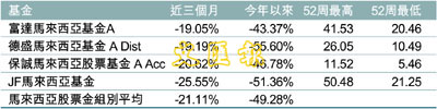此次金融海嘯危機對東南亞國家或地區所造成的影響也不可低估。比如馬來西亞的令吉在今年的首個10月,累計貶值達7.3%,吉隆坡證交所指數比年初下跌40%,主要是受到原料價格下挫的影響。馬來西亞股票金組別今年平均已跌近5成,估值已跌至相對吸引的水平,在投資市場信心漸穩下,大馬基金仍可考慮趁低布局。