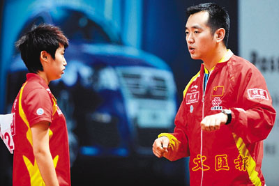 ■孔令輝(右)在巡迴賽總決賽期間指導郭躍。 新華社