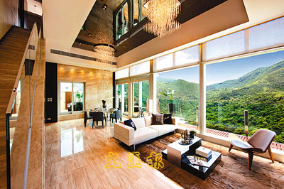 客飯廳與通往上層的樓梯採用玻璃圍欄,讓視線穿透而過,俯視整個客飯廳以及窗外壯麗山景。樓梯以名貴淺棕色雲石鋪砌,令空間感加以提升,更凸顯豪宅氣度。