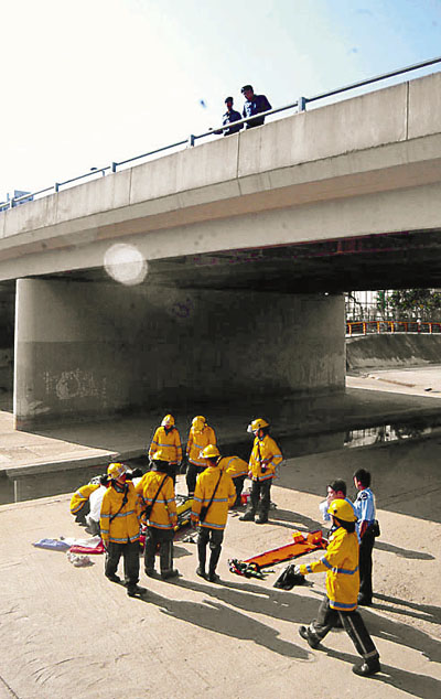 【本報訊】大圍城門河昨日發生跳橋墮河案,一名男子突由行車天橋上飛跳8米下城門河,惟河道乾涸,男子當場重傷,送院搶救情況危殆,警員事後在其背囊檢獲數千元現金,並無發現任何遺書,警方正對其跳橋原因展開調查。