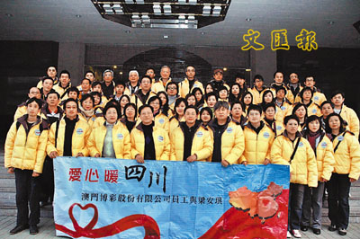 【本報駐澳門記者陸展鵬電】四川大地震發生以來,澳門博彩股份有限公司以及各相關聯營機構員工先後兩次自發組織了大型員工籌款募捐活動,共籌得善款總額超過900萬元。而由澳博員工福利諮詢委員會組成的「愛心暖四川」探訪團,日前出發前往四川地震災區探訪,希望能為冬日中的災區兒童帶來溫暖。