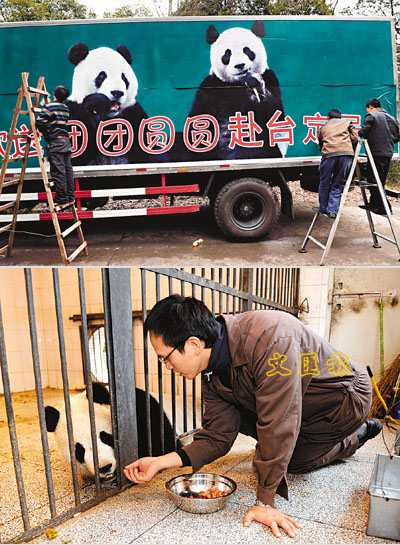 ■(上圖)運送「團團」「圓圓」的卡車和鐵籠均用牠們的照片裝飾起來。(下圖)到四川受訓的台灣飼養員王進治在學習訓練「團團」四肢趴地。 新華社