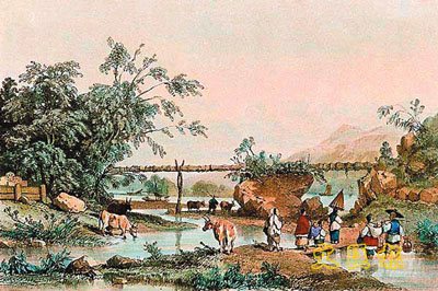阿羅姆所繪的畫面看起來頗為美麗動人:在清澈的水塘、嶙峋的岩石、扶蘇的林木映襯下,一條竹製的水渠在陽光下穿山而過。近處有著短裝的農夫或苦力正用陶罐在塘中汲水,遠處還見牛隻在悠閒地散步。最有意思的是在橋上迎面相逢的人物,竟是兩個身披袈裟的和尚與一位穿著黑袍的牧師!