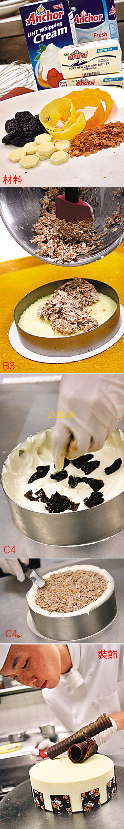 4. 將一半材料注入蛋糕模中,盡量鋪滿邊緣,擠出多餘空氣,然後可放進西梅,並注入剩餘的另一半材料。放雪櫃冷藏10分鐘後,可將B部分的脆層放入,最後鋪上剩餘的蛋糕材料,略為雪藏後,可在蛋糕上面放置各種裝飾及其他配料。