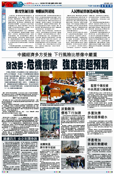【本報北京新聞中心記者劉凝哲24日電】國家發改委主任張平24日代表國務院,向全國人大常委會報告應對金融危機和經濟下滑的背景和措施。張平坦言,此次金融危機涉及範圍之廣、影響程度之深、衝擊強度之大均超出預料,目前已在企業利潤、財政收入、商品價格、消費市場、新增就業等方面對中國經濟產生較大影響。他表示,「金融危機仍未見底,對實體經濟的影響和衝擊還在加深」,因此如何應對金融危機,保持經濟平穩較快增長,已成為未來兩年實現中國「十一五」規劃目標的嚴峻考驗。