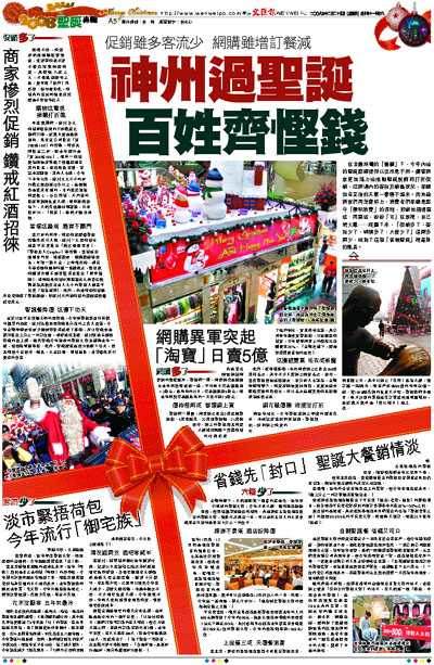 在金融海嘯的「眷顧」下,今年內地的聖誕節顯得與以往很是不同。儘管商家更加落力地推動聖誕裝飾和打折促銷,但商場內的客流及銷售狀況,卻總如冬至後的天氣一樣暖不起來。而無論商家們再怎樣努力,消費者們卻總是堅守「精明消費」的原則,把銀包捂得緊些、再緊些,紛紛「宅」在家裡,自己烤火雞……縱觀下來,「促銷多了,客流少了,網購多了,大餐少了」這兩多兩少,成為了這個「省錢聖誕」裡最新的風景。