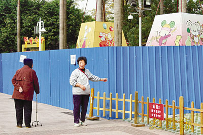 據當時在場的市民李女士說,她早上在公園中心台處看到了木樁和警示標誌,走近一看,發現木樁裡面有約4平方米的地陷,地陷之外的地面顯得有些不平整。在公園中心台李女士所說的地方,記者看到,下陷的地面被木樁圍住,木樁上面掛有「危險,請勿靠近,多謝合作」的警示牌。記者看到了地面下陷的情況,面積約有4平方米,下陷的深度約有30厘米,下陷地面周圍的地面有少許凸凹的弧度。一名保安在地陷周圍執勤,防止有遊人進入地陷路面,該保安說:「地陷是發生在早上7時,以前都沒有看到過。」