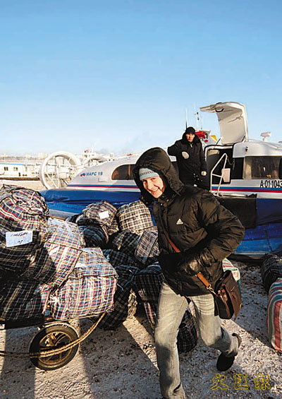 聖誕節前夕,許多俄羅斯遊客乘坐氣墊船來到中俄邊境城市—黑龍江省黑河市,採購物品。圖為一位俄羅斯遊客帶著買到的物品準備登上氣墊船。 新華社
