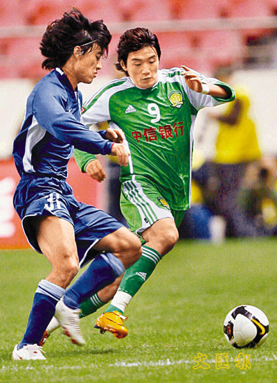 ■國安隊杜文輝(右)被調整出國足。新華社